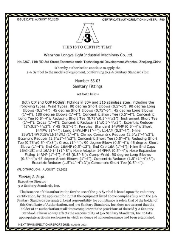 | Standard | SMS, GB, ISO, DIN, 3A, IDF |